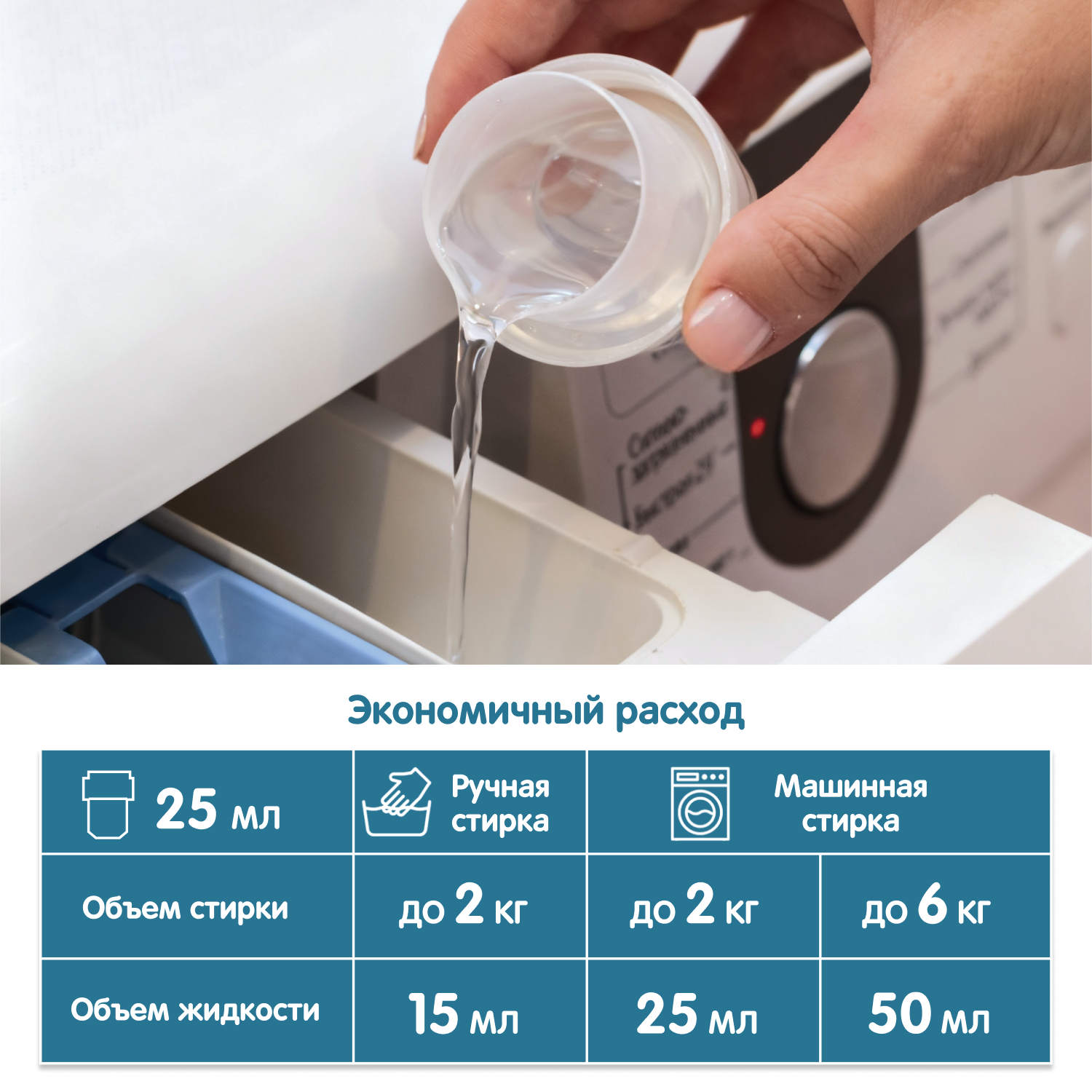 Prevents yellowing, preserves the shape of garments and the structure of the fabric. The convenient ergonomic bottle cap doubles as a measuring cup, holding 25 ml. Economical usage: 1-2 caps per wash, depending on the load size. Suitable for all types of washing machines and hand washing.