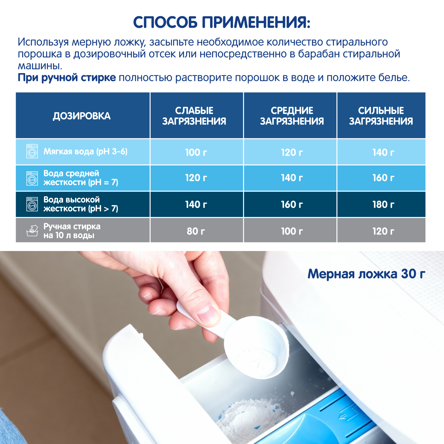 Directions: When choosing a washing cycle and temperature, follow the recommendations on the labels of your items. Using a measuring spoon, pour the required amount of detergent into the dosing compartment or directly into the washing machine drum. For hand washing, completely dissolve the detergent in water and add the laundry.